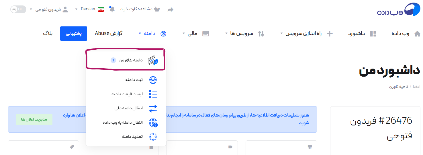 جهت ساخت نیم سرور اختصاصی نیاز است در پنل کاربری خود از طریق هدر سایت وارد قسمت دامنه میشوید