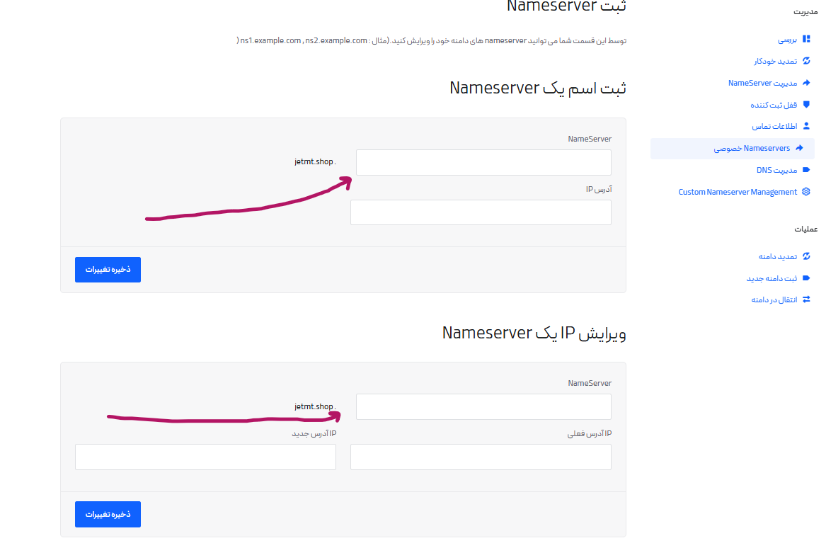 سپس وارد قسمت Nameserver اختصاصی میشوید و IP خود را در قسمت های زیر قرار میدهید و ns1,ns2 را برای آن تعریف میکنید